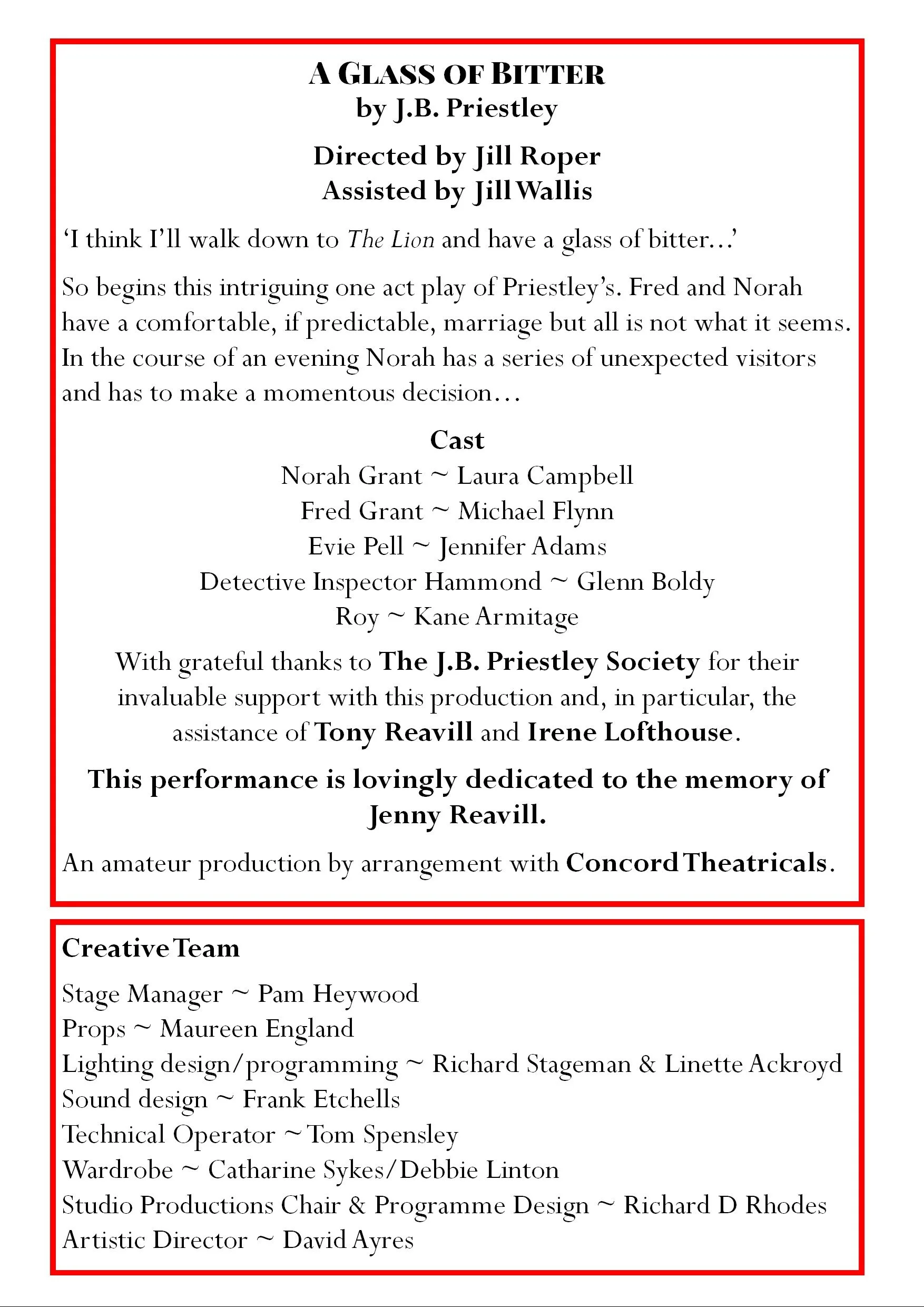 With the cooperation of the JBP Society, Bingley Little Theatre put on one of Priestley’s lesser-known short plays ‘A Glass of Bitter.’ It was performed to a packed house in BLT’s 80-seat Studio on the evenings of November 28th to 30th, and was paired with a newly written play about Bradford, “Wool City”. A manned display about JB was featured each night.